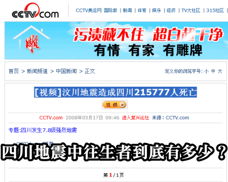 感謝doctor兄提供的報導素材,也感謝箸ㄟ前幾天提供的擷圖。中國四川地震中,到底造成多少人往生?這個大問題,可能連中國政府都還搞不清楚吧,而且中國政府看來也不想去查明白,因為中國連「失蹤人口」都還無法公佈確切證據。然而在「失蹤人口」都無法確認的情形下,中國政府已經急於爆破廢墟,湮滅證據,這些「失蹤人口」顯然只能長埋廢墟再無重見天日機會,或許對中國政府而言,那不過是一長串數字而已,可是對該國災民而言則是一種無可言喻的悲哀吧。生,無人知;死,無人曉,哀,莫過於此。箸ㄟ提供一幅CCTV的擷圖,上面清楚標著215777人,但也不清楚究竟是手民誤植呢?還是不小心洩漏機密所致?後來這個5/17的網頁就遭刪除不復再見。另外,中國網民驚訝於日本媒體參照中國官方報導製作的傷亡統計圖表,他們認為那張圖表很精細。顯然他們對地震傷亡統計完全沒有概念,而且也不懂得要求中國政府去落實,只是得過且過的幫中國宣傳籠統的死亡人數而已。可以確定的是,就跟六四天安門事件一樣,死亡人數永遠無法公佈吧,除非等到中共垮台資料解密,才有機會吧。